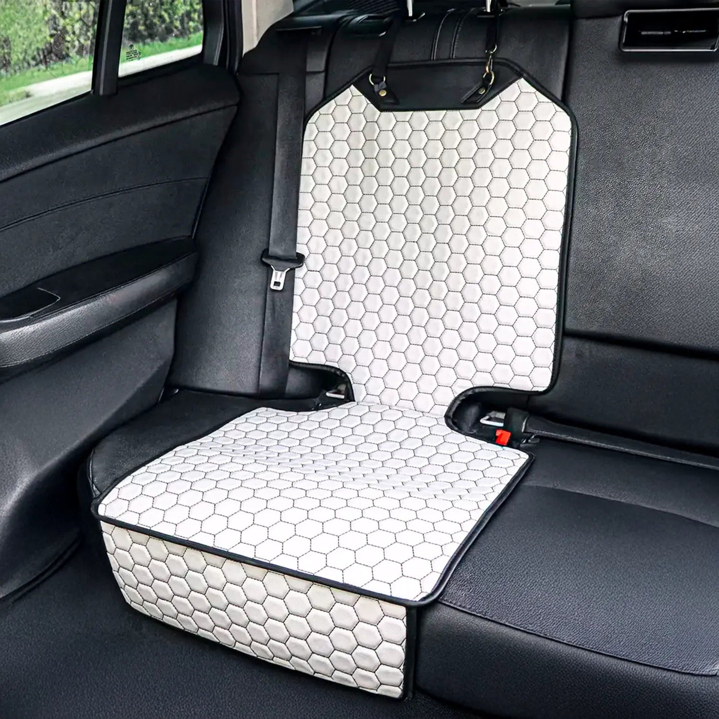 Dette bilsædebeskyttelsesmåtte tilbyder en effektiv barriere mod pletter og spild. Dens hvide hexagonale design tilføjer et strejf af elegance til interiøret i dit køretøj. Let at installere, den passer til de fleste køretøjer.